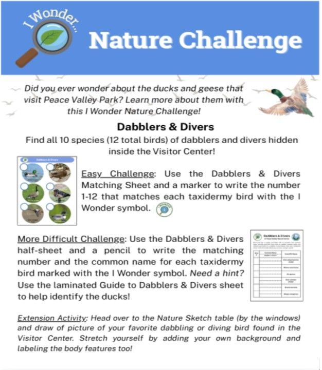 - Did you ever wonder about the ducks and geese that visit Peace Valley Park? Learn more about them with this I Wonder Nature Challenge!